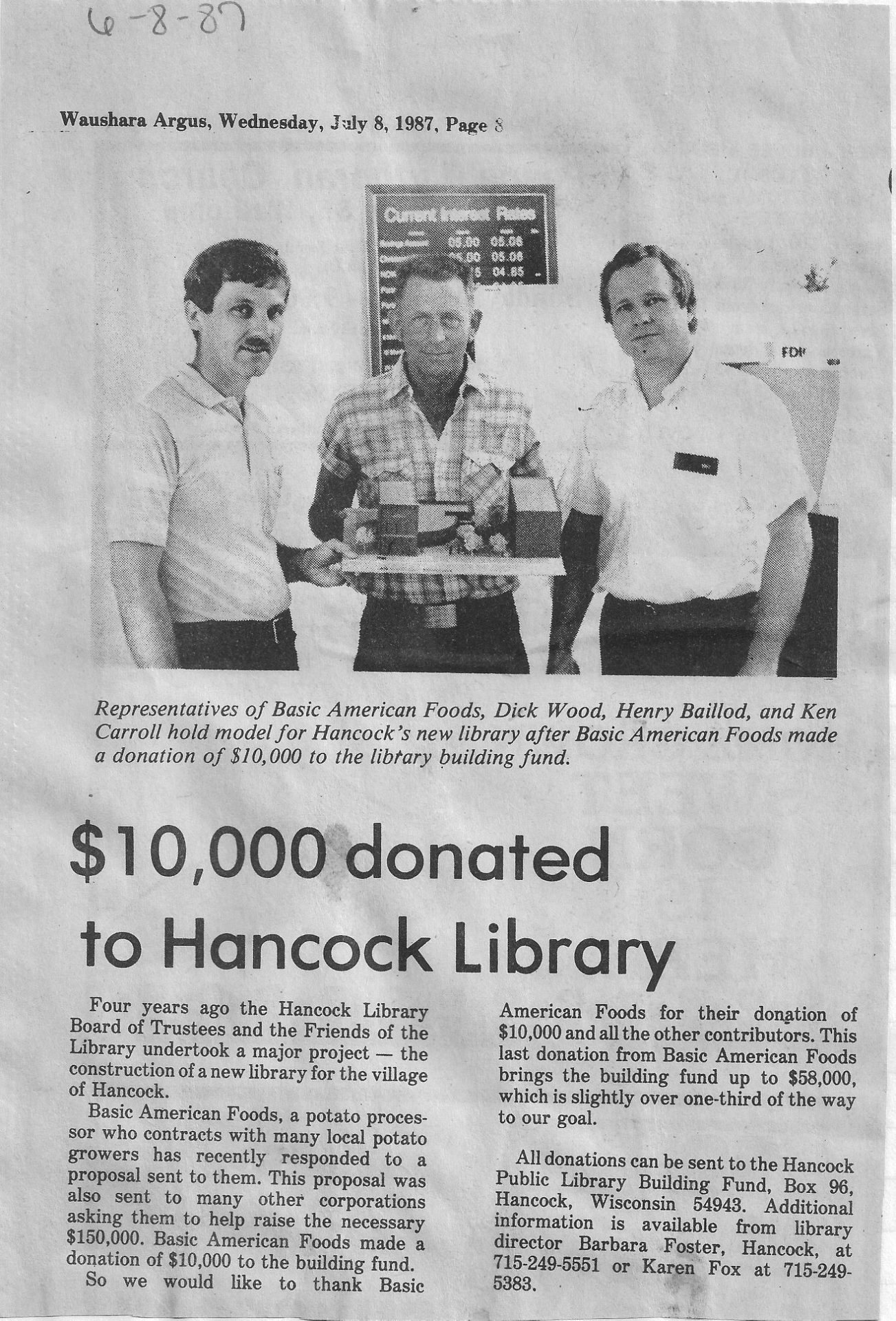 From the newspaper article “$10,000 donated to Hancock Library” written by Logan Baillod