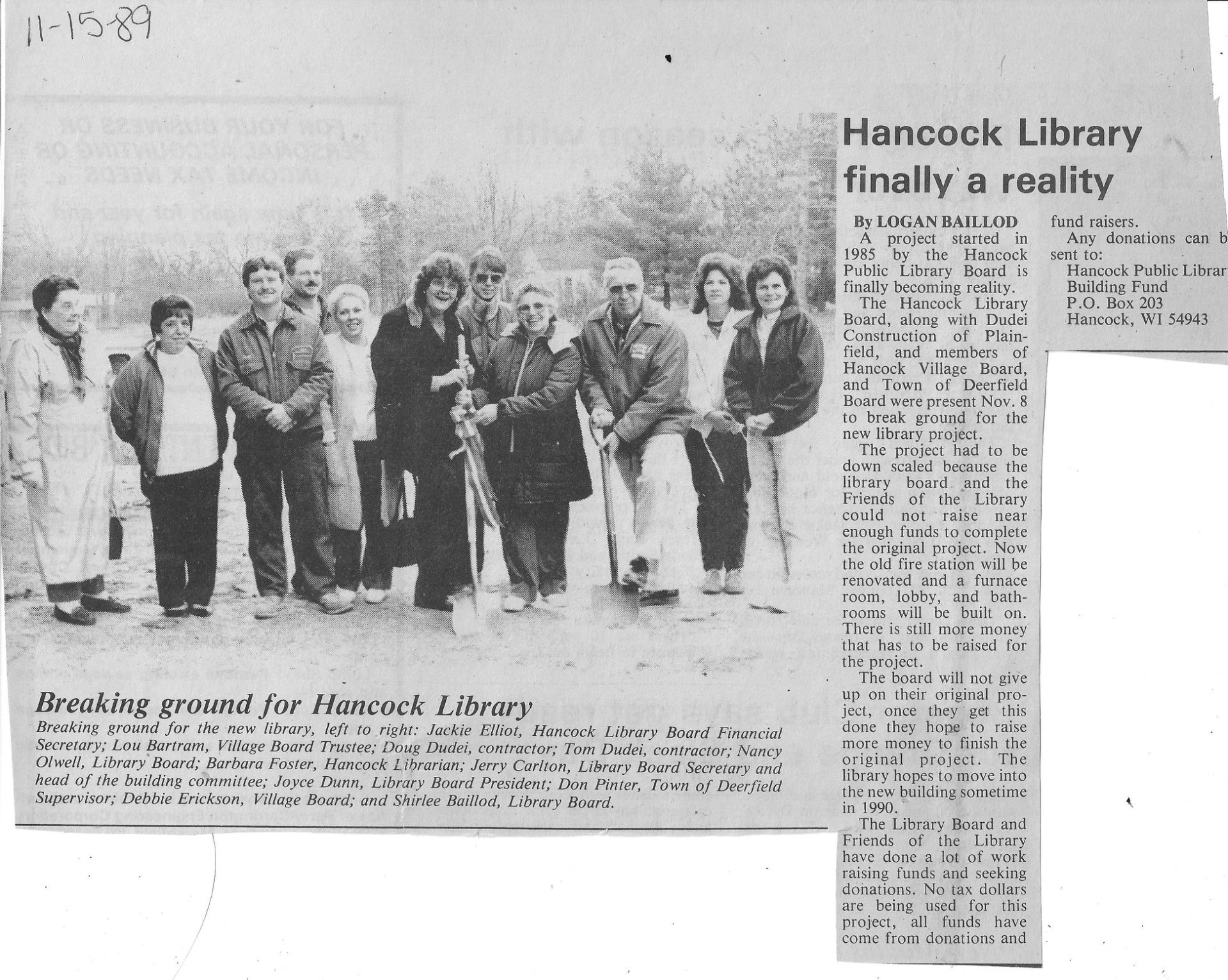 From the newspaper article “Hancock Library finally a reality” written by Logan Baillod