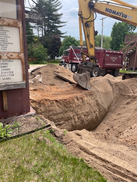 Home / News / Library Expansion Update The library’s grand re-opening took place on Saturday February 14, 2026. Thank you! Rendering of planned expansionConstruction working near the entranceHancock Fire Dept. graphic used in new part of building